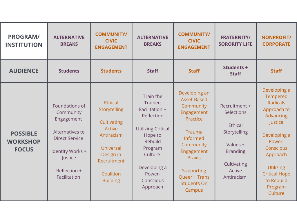 We work directly with you to craft an agenda for your workshop or training retreat that will give participants the tools they need to be effective leaders and push the needle towards justice.